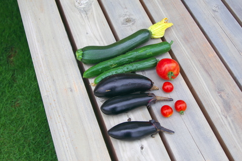 本日の「収穫」です。ズッキーニは隣の畑の方からもらいました。