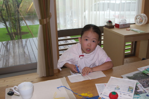 夕方から生憎の雨で、お母さんが「ランチョマット」を作っているのを見て